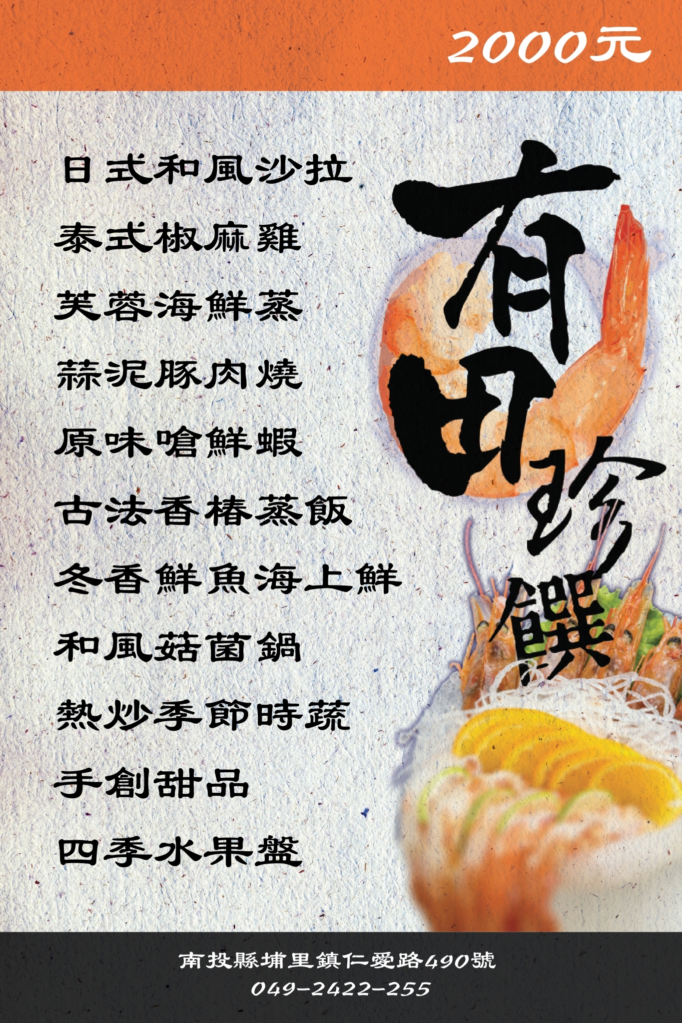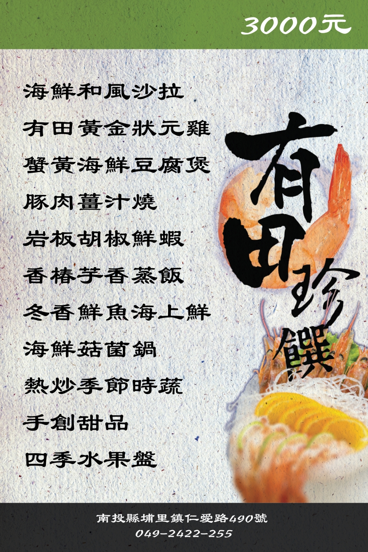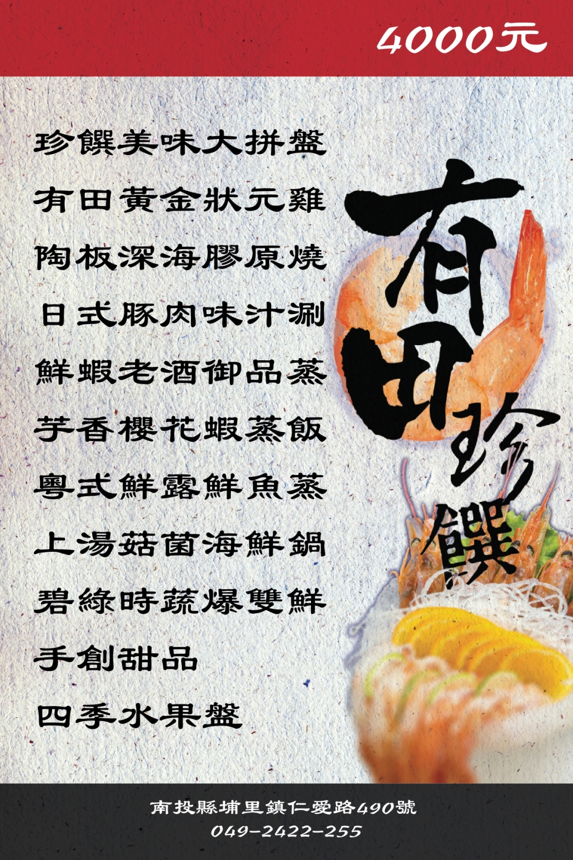 詳情請電洽049-2422-255,或到有田珍饌(南投縣埔里鎮仁愛路490號)洽詢